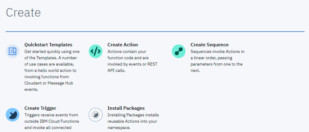 To create a function first navigate to functions from the IBM Cloud main menu on the left and click start creating